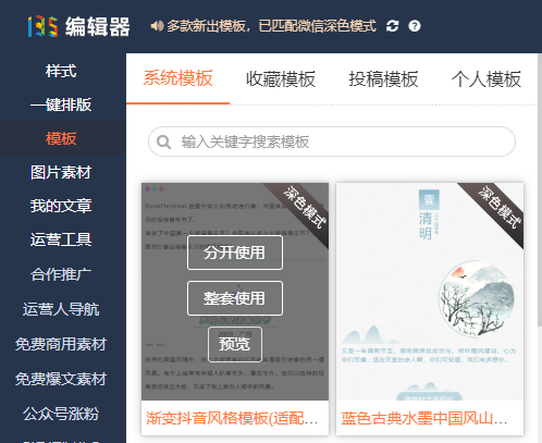 點擊左側『模板』,在『系統(tǒng)模板』中即可看到很多右上角標著『深色模式』的模板啦,這些模板都是完美適配深色模式的哦!