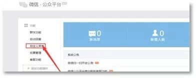 STEP1:登錄自己或者想要修改菜單的公眾號賬號,如圖所示,找到“功能”項目子菜單中的“自定義菜單”