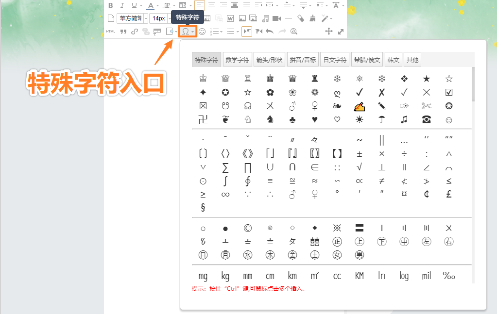 這個簡單!在編輯器上方找到『特殊字符』按鈕,點開后里面就會有各種各樣的小符號任你選擇,點擊你想要的小符號即可插入至編輯器。按住Ctrl鍵,可以連續(xù)插入多個小符號哦。
