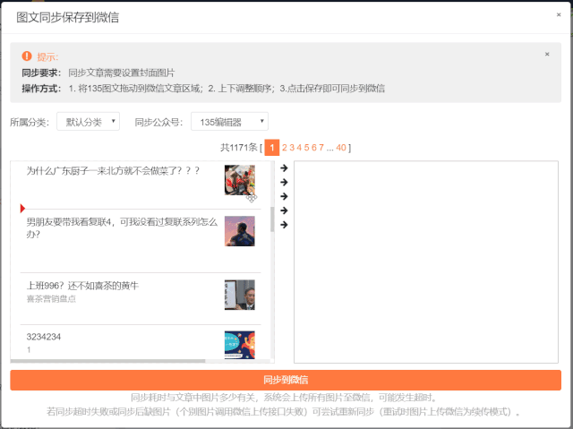 2.將需要同步的文章拖入到左邊的窗口,圖文的順序也可以通過拖動來進行調(diào)整。