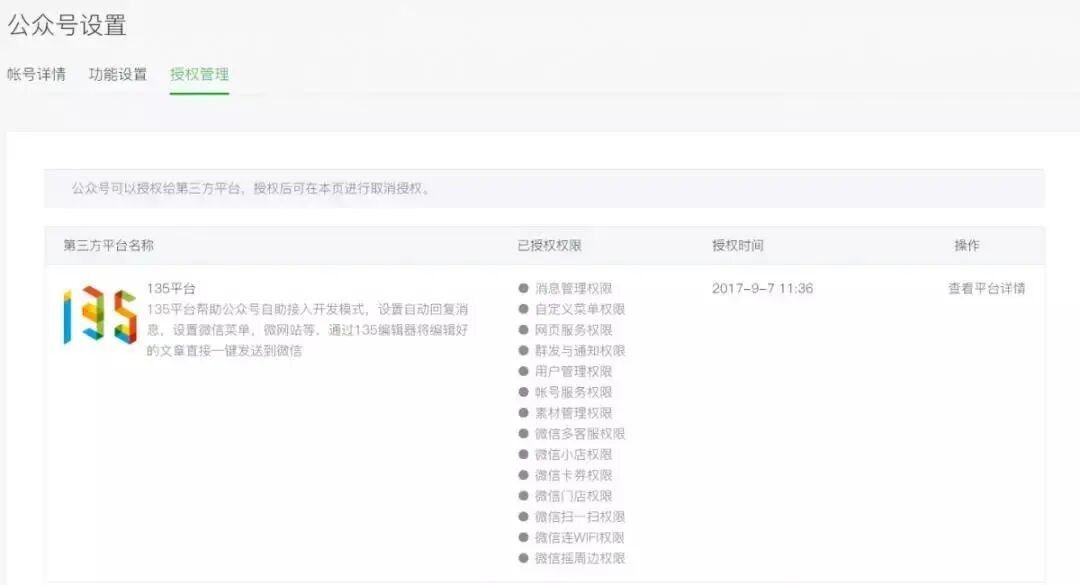 在手機上確認后,我們的綁定工作就完成啦!我們可以在下面兩個頁面中,找到公眾號授權(quán)信息。