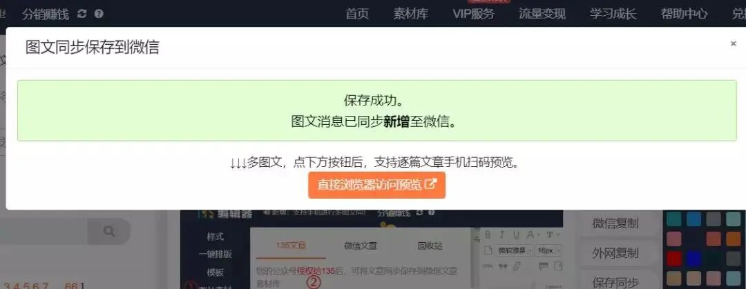 3.點擊『同步到微信』,稍等一會系統(tǒng)就會提示保存成功,我們就可以在微信公眾平臺看到啦!