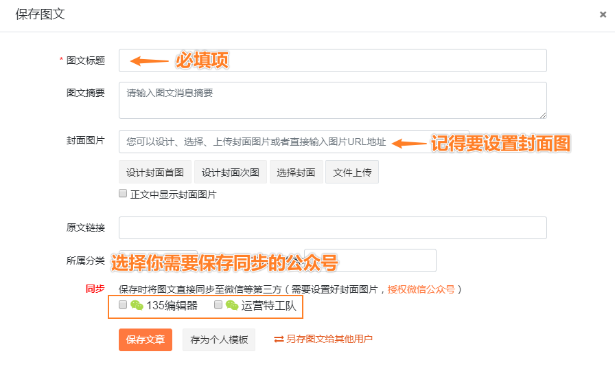 2.填寫文章的『標題』,上傳文章『封面圖片』,選擇需要同步的公眾號。這里需要注意的是,如果不上傳封面圖的話,會導(dǎo)致保存同步失效的哦。