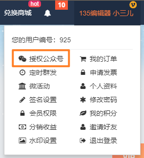 1.將鼠標放在135編輯器右上角的名稱處,找到『授權(quán)公眾號』按鈕。
