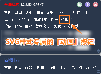 將編輯器切換到專業(yè)版模式,點(diǎn)擊樣式區(qū)域彈出對(duì)話框,在【全局樣式】中點(diǎn)擊動(dòng)畫按鈕,開始修改SVG樣式參數(shù)。