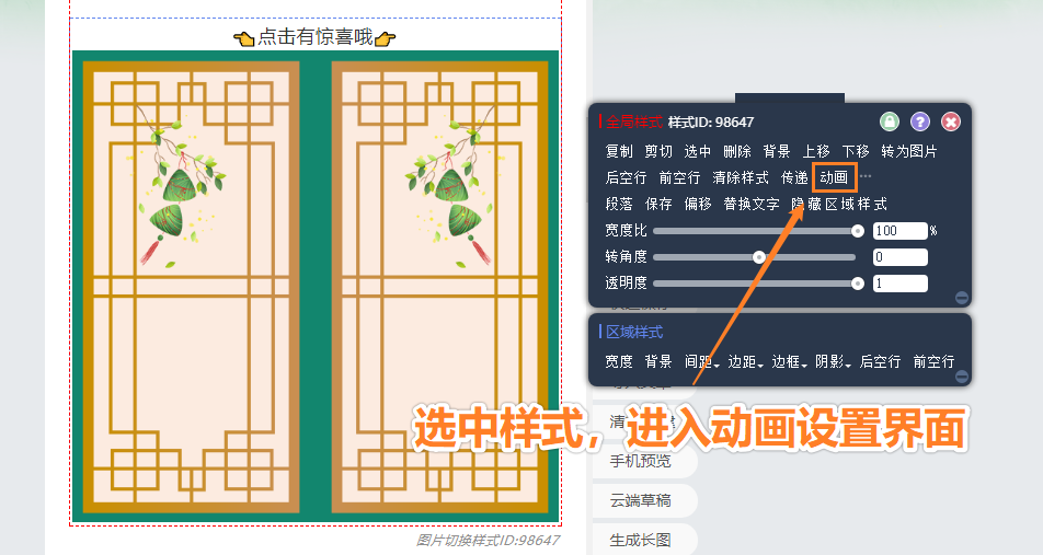 這里需要注意的是:編輯時(shí)請(qǐng)不要點(diǎn)擊圖片區(qū)域,以防觸發(fā)動(dòng)畫保存失效。