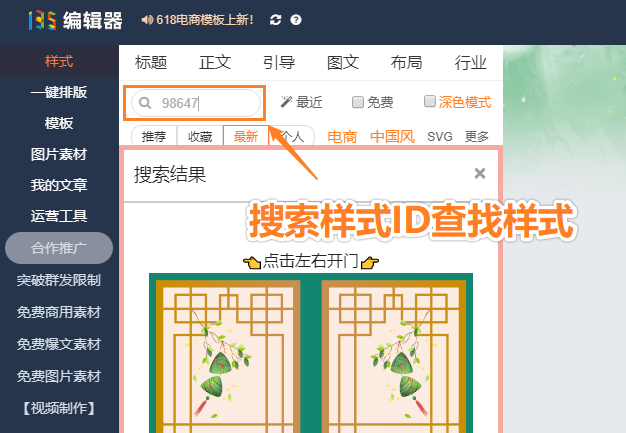 2.切換完成后,我們就可以對(duì)樣式進(jìn)行修改了,在左側(cè)搜索樣式ID『98647』,將樣式插入至編輯器中。