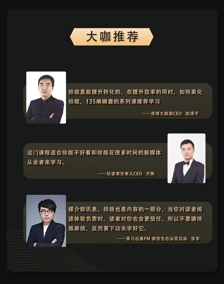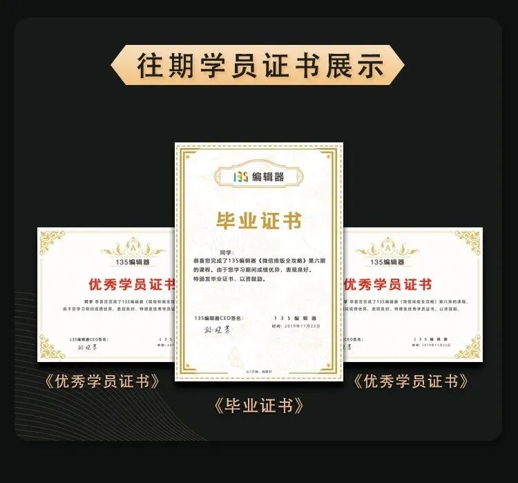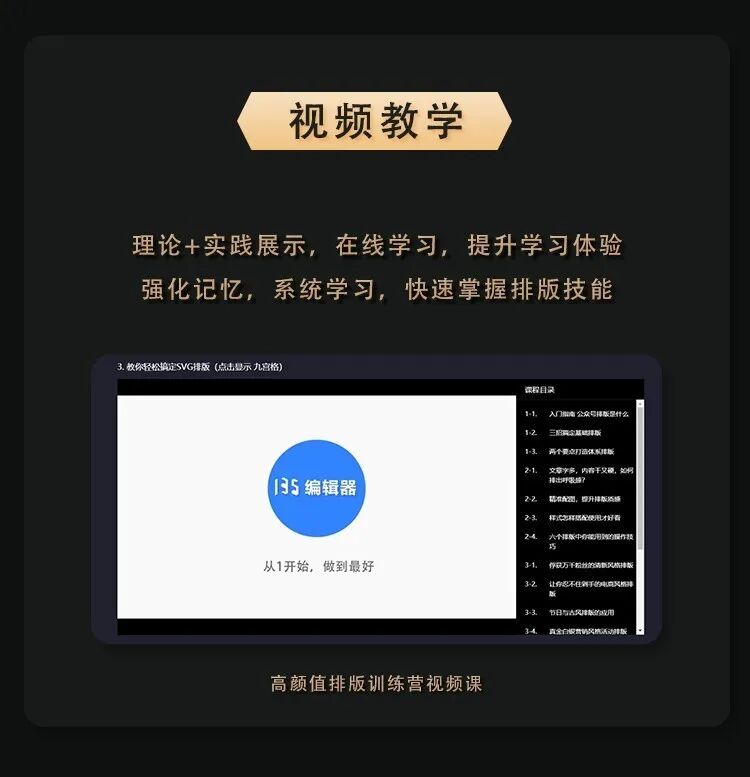 在最新一期的課程里,135編輯器課程團(tuán)隊(duì)吸取了前幾期學(xué)員遇到的問(wèn)題及建議,對(duì)課程進(jìn)行了全面翻新,著重對(duì)SVG、排版技巧進(jìn)行更新。課程也由原來(lái)的17章節(jié)變?yōu)?9章節(jié)。力圖將最新最全的公眾號(hào)排版知識(shí)展現(xiàn)給你,手把手教你從入門到精通公眾號(hào)排版!