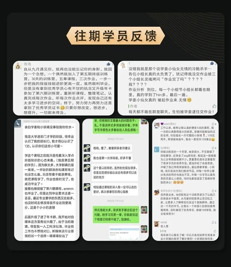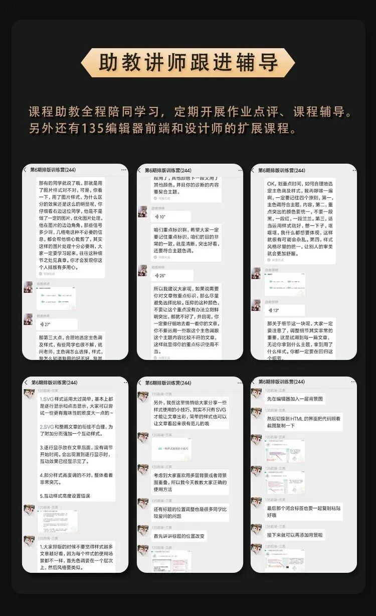 排版訓(xùn)練營(yíng)是135編輯器針對(duì)新媒體小編開(kāi)設(shè)的一個(gè)線上排版教學(xué)培訓(xùn)。在1個(gè)月的時(shí)間內(nèi),圍繞排版這一主題,持續(xù)不間斷的系統(tǒng)學(xué)習(xí)排版知識(shí)。有助教和班主任全程督促和陪伴你,讓你排版水平顯著提升,優(yōu)秀學(xué)員可以和135編輯器有很多的合作機(jī)會(huì),如接代排版、成為助教等。