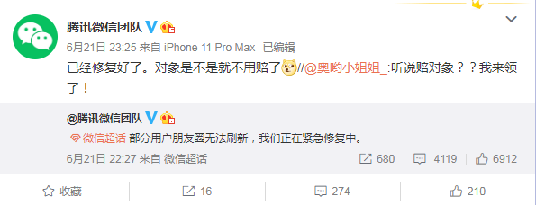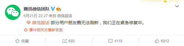 截止6月21日23點(diǎn)23分,微信團(tuán)隊(duì)在微博稱(chēng):“已經(jīng)修復(fù)完成。”