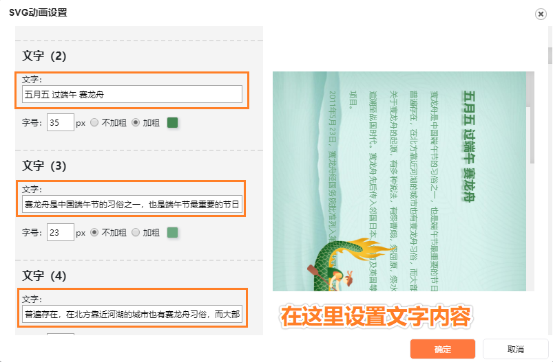 4.在動畫設置界面,我們就可以對樣式的內(nèi)容進行設置了,胖友們可以對圖片,文字,以及龍舟進行更換。