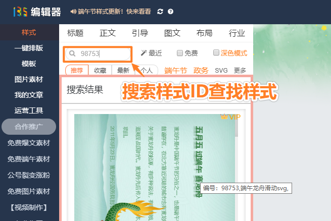 2.切換完成后,我們就可以對樣式進行修改了,在左側(cè)搜索樣式ID『98753』,將樣式插入至編輯器中。