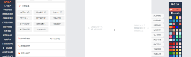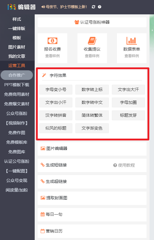 在135編輯器左側(cè)工具欄【運(yùn)營工具】為您提供了豐富多樣的運(yùn)營工具,其中字符效果可以應(yīng)用到公眾號推文當(dāng)中,具體功能介紹如下。