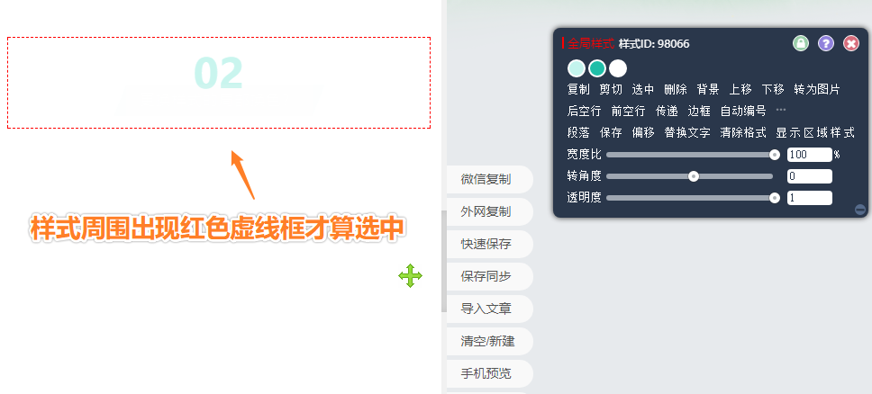 這個簡單,我們先將樣式插入編輯器中,點擊選中樣式(只有樣式四周出現(xiàn)紅色虛線才算選中哦)。