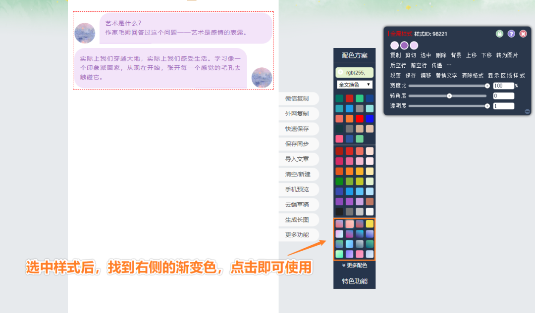 怎么樣,是不是特別炫酷,接下來教大家如何將樣式的顏色更改為漸變色,首先將樣式插入至編輯器中,點擊選中樣式,然后在右側的『配色方案』中,找到底部的漸變色區(qū)域。