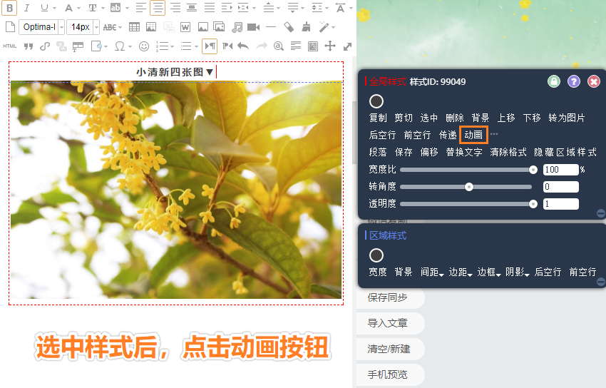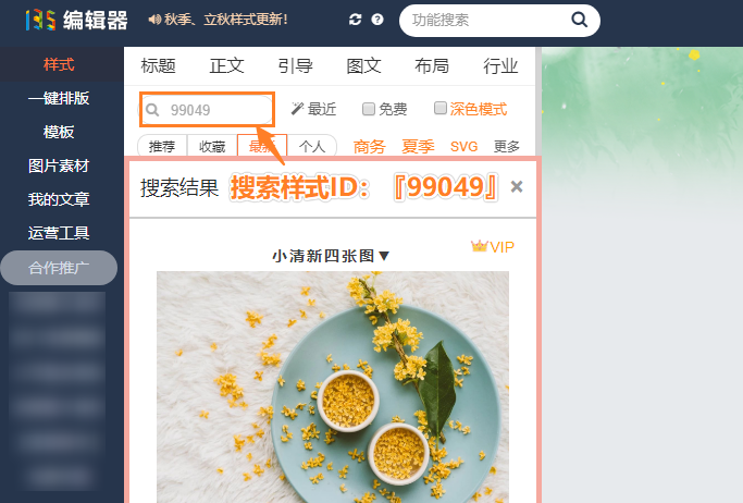 2.搜索樣式ID:99049,找到『點擊切換圖片』樣式,插入至編輯器中。