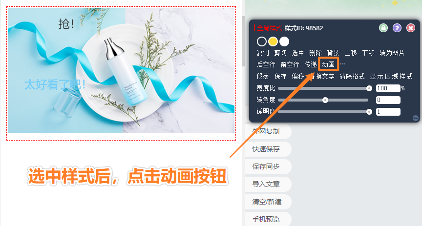 3.點(diǎn)擊選中樣式(在樣式周圍出現(xiàn)虛線框時(shí),才算選中哦?。趶棾龅牟藛螜谥?,選擇『動(dòng)畫』按鈕,進(jìn)入動(dòng)畫設(shè)置界面。