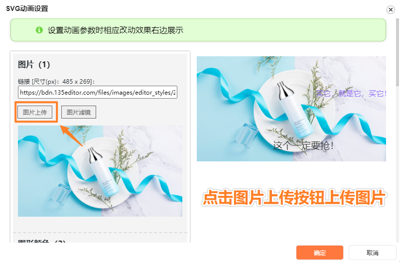 4.在動(dòng)畫設(shè)置界面,我們就可以對(duì)樣式內(nèi)的圖片和文字進(jìn)行更換了,胖友們可以點(diǎn)擊鏈接下方的『圖片上傳』按鈕上傳圖片。