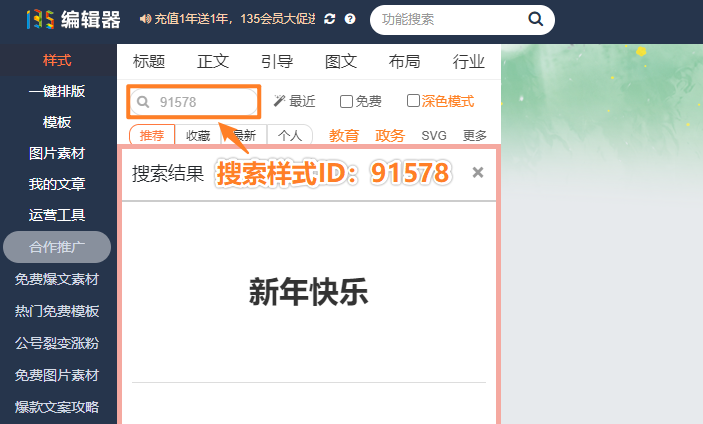 2.搜索樣式ID:91578,找到『點擊切換』樣式,插入至編輯器中。