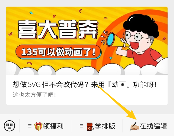 第一步:手機(jī)微信搜索【135編輯器】微信公眾號,點(diǎn)擊公眾號主頁右下角【在線編輯】,進(jìn)入編輯頁面。