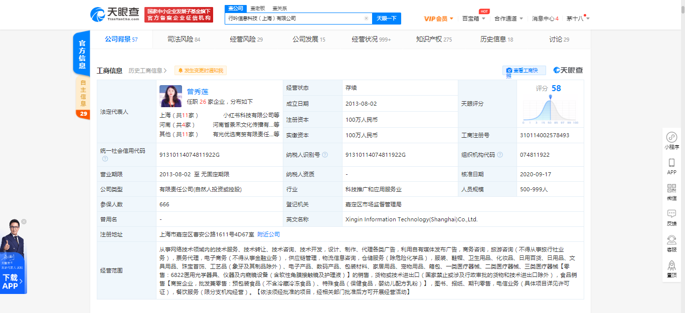 天眼查App顯示,行吟信息科技(上海)有限公司成立時(shí)間為2013年8月,注冊(cè)資本100萬人民幣,法定代表人為曾秀蓮。經(jīng)營(yíng)范圍包括從事網(wǎng)絡(luò)技術(shù)領(lǐng)域內(nèi)的技術(shù)服務(wù);設(shè)計(jì)、制作、代理各類廣告,利用自有媒體發(fā)布廣告,商務(wù)咨詢,旅游咨詢等。