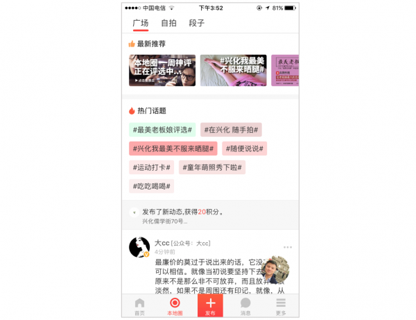 對(duì)于UGC社區(qū),如何引導(dǎo)用戶產(chǎn)生內(nèi)容是有講究的,比如知乎是通過問題來引導(dǎo)領(lǐng)域?qū)<襾斫o出回答。這一點(diǎn)上我們其實(shí)主要借鑒的是微博。好吧,我承認(rèn)運(yùn)營(yíng)妹子老來問我:”大中叔叔你到底想做朋友圈還是微博呀?“在這個(gè)時(shí)候,我的回答是:我們是用了縣域人民最熟悉的朋友圈的形式,做了縣城的微博。