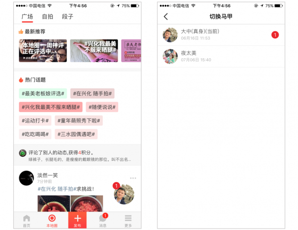 隨著場(chǎng)景的豐富,馬甲需要設(shè)計(jì)成全局的切換。其實(shí)一開始小中(我們家小產(chǎn)品經(jīng)理)在做馬甲設(shè)計(jì)的時(shí)候,主要考慮了評(píng)論的場(chǎng)景,因此很自然的做成了在填寫完評(píng)論后選擇一個(gè)馬甲。這種設(shè)計(jì)看起來影響面小,但實(shí)際上相當(dāng)繁瑣。如果這個(gè)時(shí)候來一個(gè)發(fā)動(dòng)態(tài)的場(chǎng)景,聊天的場(chǎng)景,對(duì)產(chǎn)品原有邏輯的侵入性太強(qiáng),按我的話說,就是不優(yōu)雅。更好的產(chǎn)品方案是只做全局的切換,理論上就是一個(gè)快速登出再登錄的快捷方式。