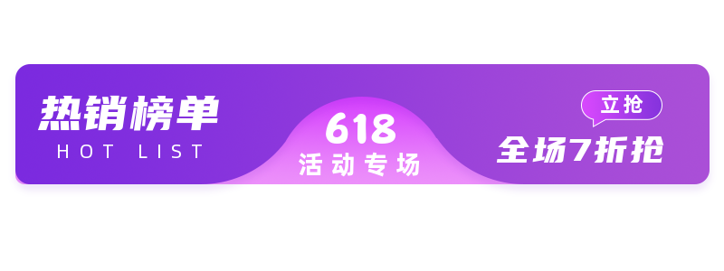 電商的618banner其實不一定都要有圖片,其實往往一些真誠的文字更能打動人心,雖然好的文案可以幫助我們吸引用戶,但是排版和設計一定要重視,下面這款純文字banner就做的很好,紫色調(diào)背景更吸睛,同時三塊白色文字區(qū)簡潔明了,用戶輕松了解清楚優(yōu)惠,自然也能更快的產(chǎn)生購買欲望。