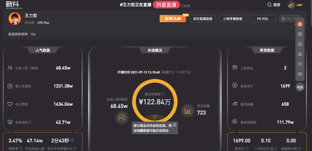 據(jù)新抖數(shù)據(jù)顯示,王力宏的直播帶貨累計(jì)1小時(shí)11分鐘,單場(chǎng)帶來43萬漲粉,累計(jì)觀看人次達(dá)到1231萬,商品銷售額預(yù)估為122.8萬。