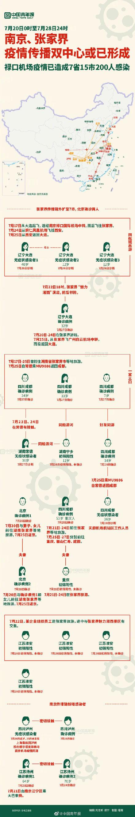 7月20日0時至28日24時,南京祿口機場相關疫情已造成全國7省15市200人感染,其中南京本地感染者173例。南京傳播鏈昨日增擴到揚州。同時,由南京病例外溢到張家界引發(fā)的新傳播鏈,目前以張家界為中心,外擴至包括北京、成都在內的7市。北京已確診兩例張家界關聯(lián)病例。7月28日,成都出現(xiàn)一名在天府機場工作的無癥狀感染者,他曾于7月25日與成都確診病例搭乘同一航班返蓉。天府機場是本次疫情中第二個出現(xiàn)員工感染的機場。