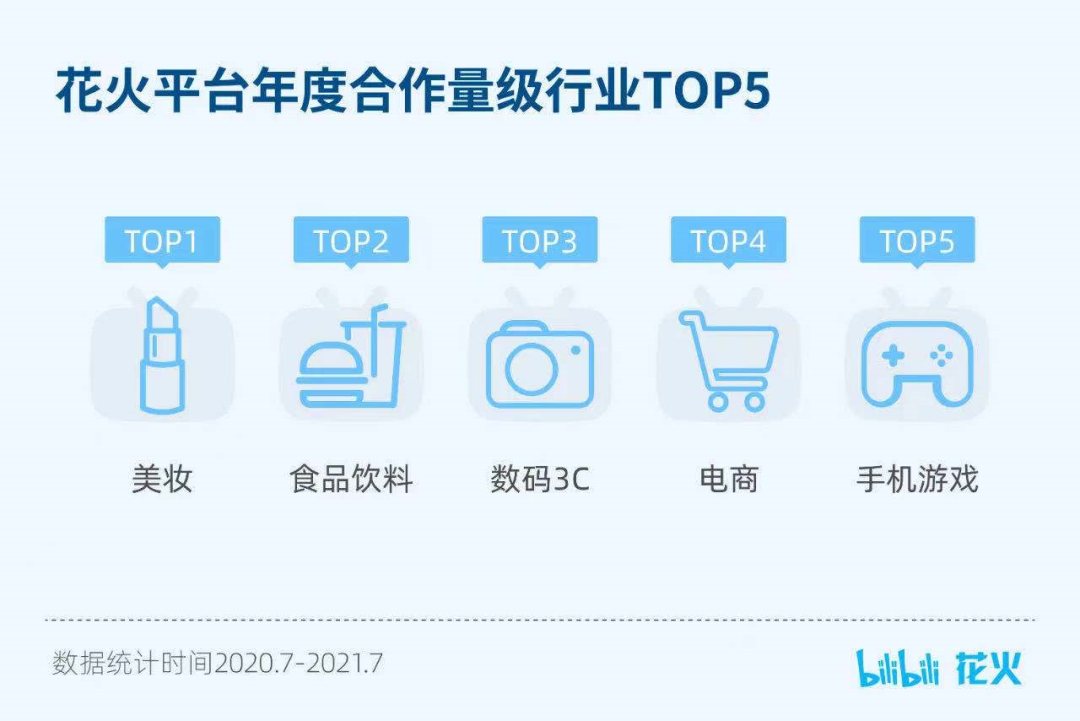 8月2日,B站首次披露“花火”開放一周年的相關(guān)數(shù)據(jù)。截至今年6月,入駐品牌同比增長(zhǎng)2050%。從GMV上看,位列前五的行業(yè)分別是美妝、食品飲料、數(shù)碼3C、電商、手機(jī)游戲,其廣告主構(gòu)成與互聯(lián)網(wǎng)廣告市場(chǎng)大盤基本一致。品牌在B站上復(fù)投率達(dá)到75%。