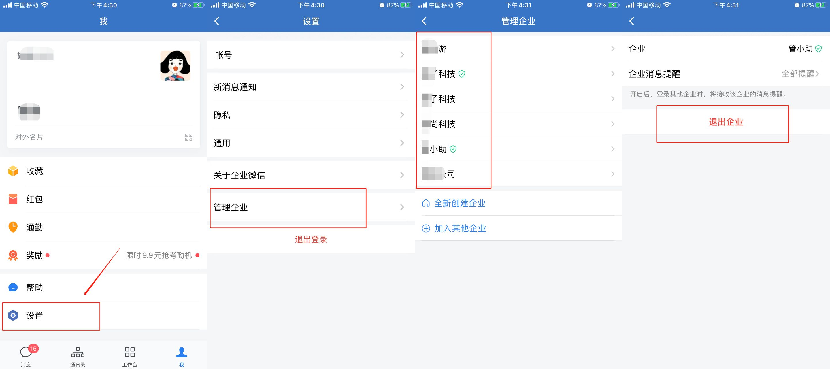 手機(jī)端可以直接打開(kāi)企業(yè)微信點(diǎn)擊【我】——【設(shè)置】——【管理企業(yè)】——【點(diǎn)擊對(duì)應(yīng)企業(yè)】——【退出企業(yè)】點(diǎn)擊退出既可。
