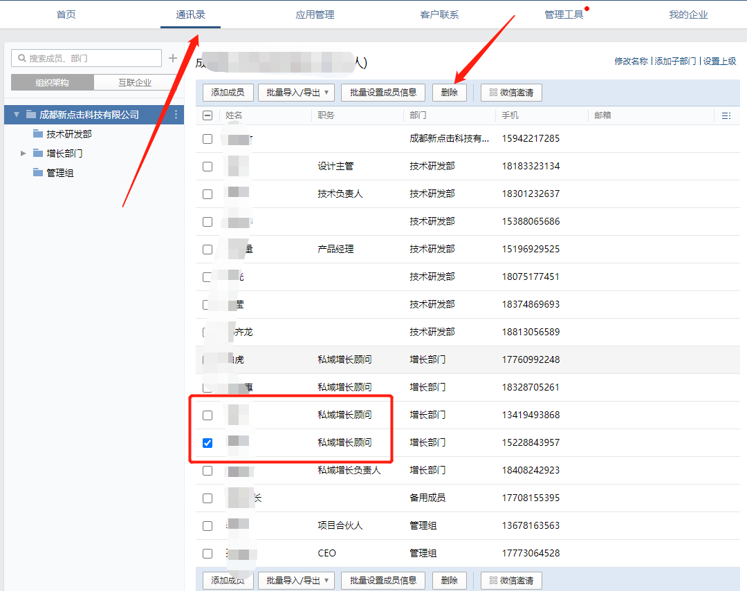 企業(yè)微信管理員登錄企業(yè)管理后臺(tái)點(diǎn)擊【通訊錄】找到需要?jiǎng)h除的成員,并且勾選他,然后再點(diǎn)擊刪除即可刪除該成員。
