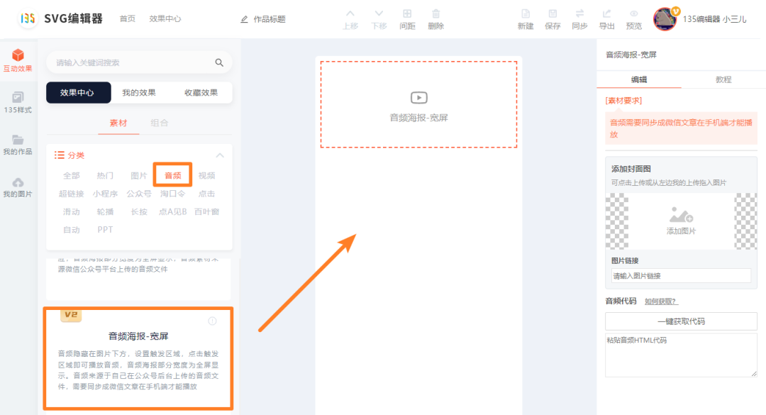 在【效果中心-音頻】分類下,找到【音頻海報(寬屏/窄屏)】組件或者搜索ID:41、42,點擊將組件添加到編輯區(qū)域