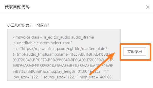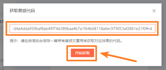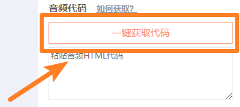 在音頻代碼的位置,點擊【一鍵獲取代碼】,將我們在第一步準備工作中復制來的帶有音頻的文章預覽鏈接,粘貼到輸入欄中;