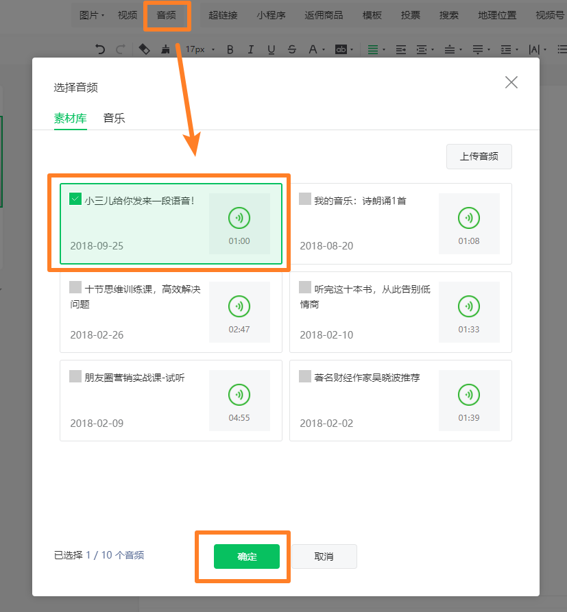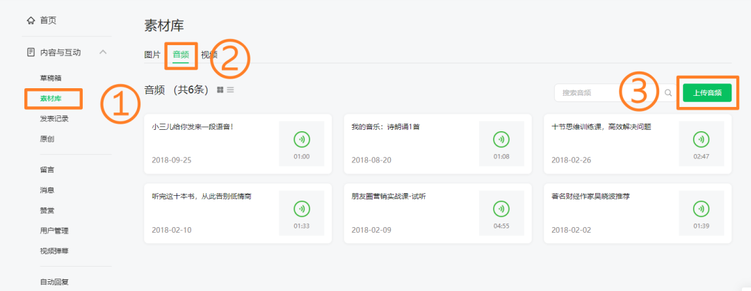 準備一段音頻,將音頻上傳到微信公眾號的素材庫中。