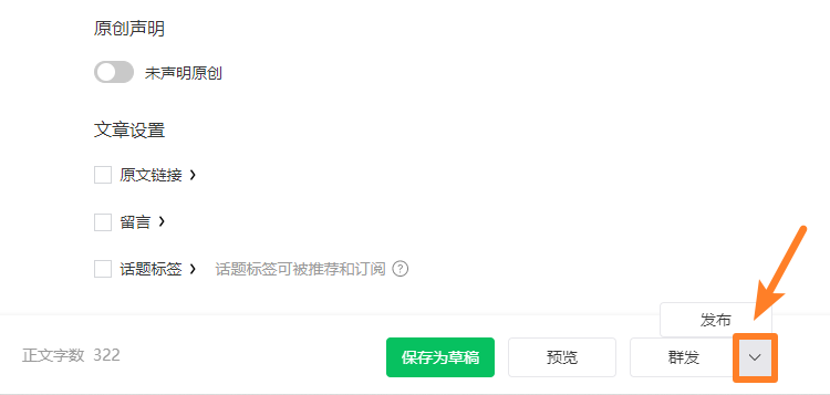 下拉至文章設(shè)置處,注意點(diǎn)擊『群發(fā)』按鈕旁邊的箭頭之后,會(huì)出現(xiàn)一個(gè)『發(fā)布』按鈕。