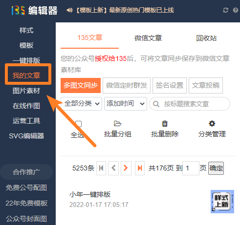 在135編輯器中保存好一篇圖文,點(diǎn)擊『我的文章』,進(jìn)入135編輯器的文章管理頁。