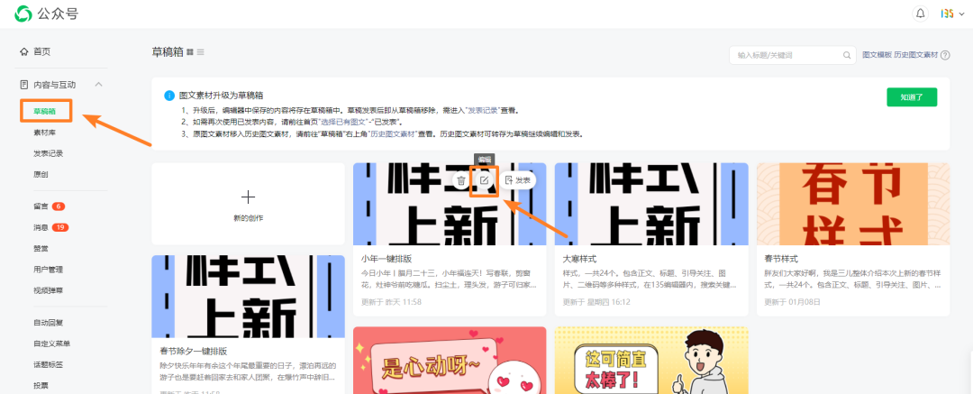 將135編輯器中排好版的圖文保存同步到微信公眾號(hào)后臺(tái)的草稿箱,在微信公眾號(hào)的草稿箱中點(diǎn)擊編輯這篇文章,進(jìn)入圖文的編輯頁面。