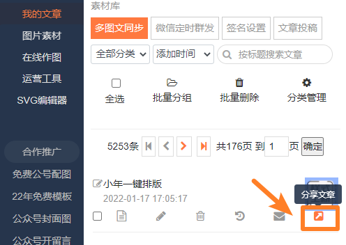 鼠標(biāo)移動(dòng)到需要生成永久鏈接的文章上方,點(diǎn)擊最右側(cè)的『分享文章』按鈕。