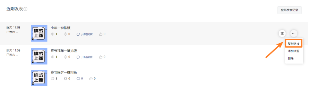 3、 文章發(fā)布后,你可以在發(fā)表記錄中獲取文章的永久鏈接,也可以將發(fā)布內(nèi)容添加到自定義菜單、自動(dòng)回復(fù)、話題和頁面模板中。