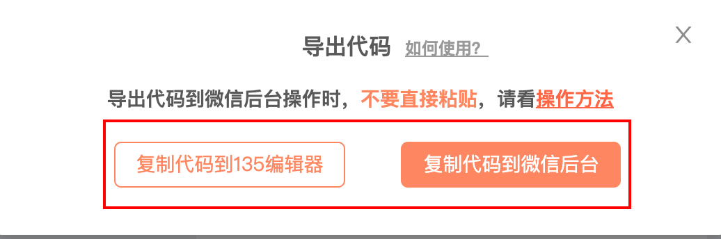 如使用導(dǎo)出代碼功能,則需根據(jù)SVG效果的使用平臺(135編輯器/微信公眾號后臺),選擇對應(yīng)平臺的代碼進行復(fù)制,盡量不要直接粘貼代碼,以免效果有誤。