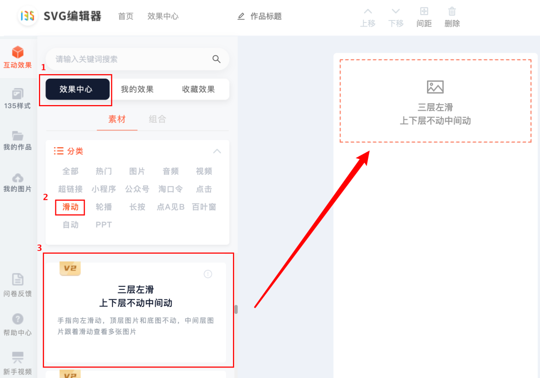 在效果中心??分類??滑動??「三層左滑上下層不動中間動」素材,點擊將其添加到中間的編輯區(qū)域
