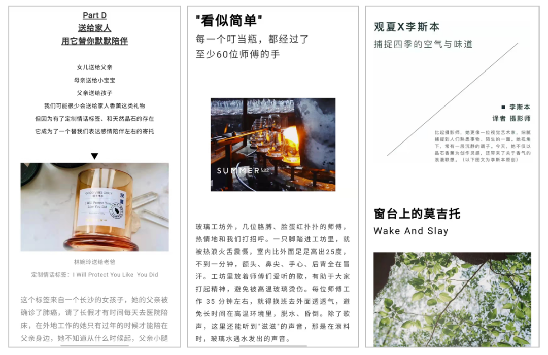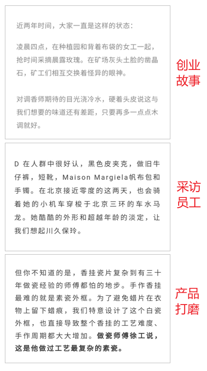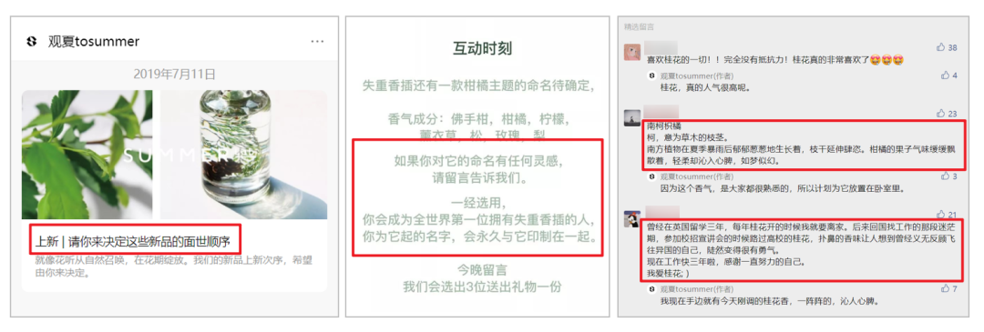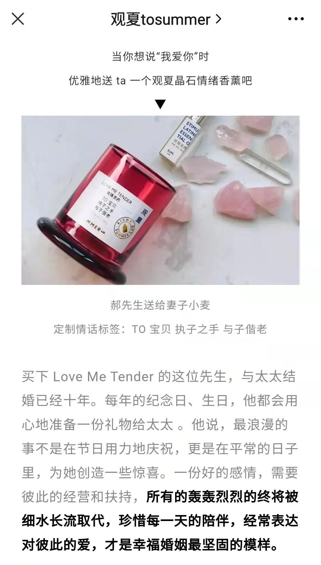 據(jù)@私域流量觀察 報(bào)道,觀夏這個(gè)小眾品牌的私域模式讓其自然復(fù)購率達(dá)到 60% ,基本都靠消費(fèi)者的口碑產(chǎn)生。運(yùn)營社分析,觀夏的高復(fù)購率,和品牌的內(nèi)容營銷不無關(guān)系。運(yùn)營社在翻閱了觀夏公眾號(hào)的推文后,總結(jié)了其內(nèi)容的三個(gè)特點(diǎn):首先,排版有設(shè)計(jì)感,文風(fēng)偏文藝。觀夏的推文排版和時(shí)尚雜志較為類似,大片的留白,文字和圖片有層次地錯(cuò)落擺放,帶有一種“文藝感”,這樣的排版和文筆風(fēng)格非常有辨識(shí)度。根據(jù)@增長黑盒 的估算,觀夏每生產(chǎn)一個(gè)主題內(nèi)容,要花費(fèi) 30-45 萬元??梢?,觀夏在公眾號(hào)的內(nèi)容上下了不少功夫。其次,觀夏的內(nèi)容里有「故事性」元素。在公眾號(hào)的推文中,品牌經(jīng)常會(huì)用敘述的口吻,和用戶分享觀夏團(tuán)隊(duì)的故事。這些文章會(huì)描述他們團(tuán)隊(duì)創(chuàng)業(yè)的歷程,采訪設(shè)計(jì)師的生活,分析產(chǎn)品的制作細(xì)節(jié),十分注意文字的可讀性和戲劇性。比如描述創(chuàng)業(yè)過程去礦場時(shí),“礦工們互相交換著怪異的眼神”;采訪員工生活時(shí),她“騎著小機(jī)車穿梭于北京三環(huán)”;談產(chǎn)品打磨過程時(shí),“香掛瓷片復(fù)雜到有三十年做瓷經(jīng)驗(yàn)的師傅都怕的地步”。通過看故事,用戶能夠?qū)ζ放飘a(chǎn)生更深的信任,甚至不知不覺地就接受了觀夏的營銷。然后,觀夏會(huì)用一些“感性”的方式,和用戶建立情感鏈接。觀夏可以定制標(biāo)簽上的祝福語,公眾號(hào)也會(huì)用用戶標(biāo)簽背后的情感故事作為題材創(chuàng)作文章,激發(fā)用戶的情感共鳴。在評(píng)論區(qū),觀夏的客服會(huì)送禮物引導(dǎo)用戶評(píng)論,分享自己的故事,或者和用戶互動(dòng),讓用戶給產(chǎn)品取名、決定上新順序,文章下方甚至?xí)显S多條“小作文”似的評(píng)論。文章中也會(huì)展示產(chǎn)品反饋的聊天記錄,表現(xiàn)出“按照用戶反饋改進(jìn)”的真誠感。在 2019 年剛剛起步之時(shí),觀夏就通過一篇篇的公眾號(hào)推文,來培養(yǎng)用戶對(duì)品牌的認(rèn)同感,從而提高復(fù)購率。③ 小程序限量發(fā)售,強(qiáng)調(diào)產(chǎn)品「稀缺性」