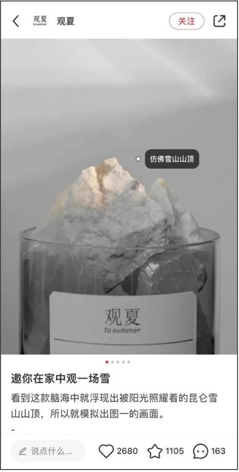 這種整體的簡約東方風(fēng)格,成為了觀夏的個(gè)性標(biāo)簽,也讓它乘上了國產(chǎn)品牌崛起的東風(fēng)。運(yùn)營社還觀察到,觀夏產(chǎn)品圖以展現(xiàn)產(chǎn)品本身為主,色彩的飽和度低,整個(gè)畫面清透。觀夏的官方賬號(hào)還會(huì)用香薰的晶石模擬出雪山的畫面,展現(xiàn)給用戶。