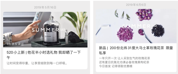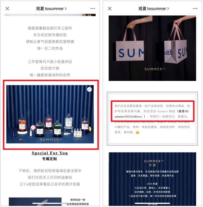 觀夏是個(gè)“含著金湯匙”出生的品牌, CEO 劉惠璞曾任世紀(jì)佳緣網(wǎng)副總裁,后來加入了聚美優(yōu)品,兩位聯(lián)合創(chuàng)始人沈黎是《時(shí)尚芭莎》前資深編輯,Khoon 是耶魯設(shè)計(jì)系畢業(yè)的韓裔設(shè)計(jì)師。通過三位“大佬”的朋友圈,觀夏連接了互聯(lián)網(wǎng)、媒體和藝術(shù)圈的人脈資源。在胖鯨頭條的采訪中, 觀夏聯(lián)合創(chuàng)始人@沈黎 透露,在沒有推廣的情況下,觀夏公眾號(hào)的第一篇文章,僅通過朋友圈擴(kuò)散,閱讀量達(dá)到了 5 萬+。據(jù)@私域流量觀察 報(bào)道,產(chǎn)品上架第一天就賣出 1000 件。當(dāng)然,靠創(chuàng)始人團(tuán)隊(duì)的朋友圈,產(chǎn)生初次購買是很容易的,但想讓用戶“愛”上一個(gè)品牌,卻需要長期的用戶運(yùn)營才能實(shí)現(xiàn)。運(yùn)營社發(fā)現(xiàn),觀夏早在 2019 年剛成立之時(shí),就已經(jīng)有了布局私域的意識(shí),屬于在新消費(fèi)品牌中做私域較早的。在 2019 年初的公眾號(hào)推文中,就嵌入小程序鏈接來引導(dǎo)用戶點(diǎn)擊小程序購買產(chǎn)品;通過“招募產(chǎn)品體驗(yàn)官”的方式來引導(dǎo)用戶添加觀夏的客服微信。② 公眾號(hào)內(nèi)容營銷,培育用戶心智,提高「復(fù)購率」