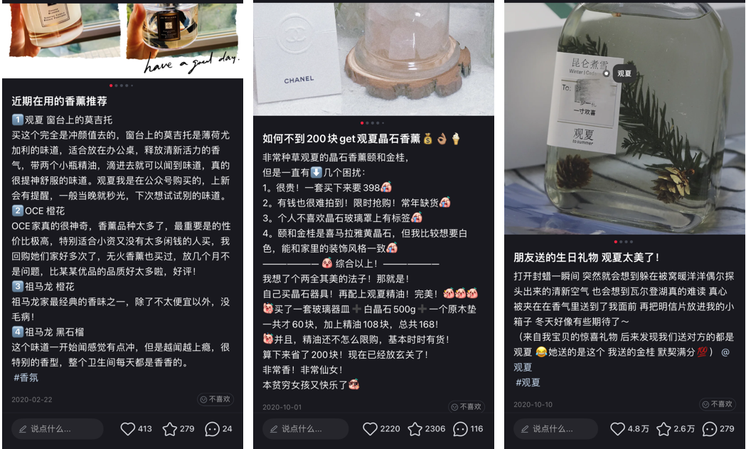 經(jīng)過 2019 年這一年時(shí)間,觀夏已經(jīng)成功通過微信私域完成冷啟動(dòng),逐漸步入品牌發(fā)展的成長期。2020 年起,觀夏開始在小紅書等更多社交平臺(tái)上布局,甚至開設(shè)了線下門店。運(yùn)營社發(fā)現(xiàn),在 2019 年底,觀夏入駐了小紅書。自 2020 年 3 月起,品牌賬號(hào)開始頻繁地在小紅書上發(fā)布筆記,并且也在小紅書上開通了店鋪。也是從 2020 年起,小紅書上有不少用戶發(fā)布有關(guān)“觀夏香薰產(chǎn)品”的筆記,曬出了自己的購買過程,以及使用過后的體驗(yàn)感受。并且,觀夏也有在小紅書做過投放。據(jù)運(yùn)營社的觀察,和其他品牌采用“ KOL+KOC 海量投放”策略不同的是,觀夏在小紅書的投放比較“克制”。千瓜數(shù)據(jù)顯示,觀夏從 2021 年 2 月至今一共只投放了 11 篇商業(yè)筆記。但是在 KOL 的選擇上,有一番講究。比如說,觀夏選擇了明星@姜思達(dá) 、香氛測評(píng)博主@戀戀聞香 ,又或者是家居博主@Leean ,還有藝術(shù)家@Duolan 多蘭。這些小紅書 KOL 都有一個(gè)特點(diǎn):文藝范兒、簡約、時(shí)尚,和觀夏的品牌調(diào)性非常吻合。由調(diào)性相符的 KOL 來推廣產(chǎn)品,粉絲們也更容易被安利。不少推廣筆記都得到了不錯(cuò)的反響。在博主@戀戀聞香 的筆記下,引起多達(dá) 200 條評(píng)論,不少粉絲表示“心動(dòng)了”。同時(shí),在微信“搜一搜”搜索「觀夏」相關(guān)的公眾號(hào)文章,會(huì)發(fā)現(xiàn)在 2020 年至 2021 年,除了觀夏官方發(fā)布的文章外,還有許多閱讀數(shù)較高的爆文。發(fā)布者多為生活時(shí)尚類賬號(hào),還包括了作家@反褲衩陣地 的賬號(hào)和@Camelia山茶花 品牌賬號(hào),內(nèi)容多為分享和推薦好物的文章。在微博上,也有許多 KOL 和消費(fèi)者推薦觀夏,或分享觀夏的使用體驗(yàn)。各個(gè)平臺(tái)上 KOL 的推廣宣傳,再加上消費(fèi)者們的自發(fā)分享“種草”,進(jìn)一步擴(kuò)大了觀夏品牌在社交平臺(tái)上的知名度。2020 年 9 月,觀夏在北京的奢侈品百貨商城連卡佛開起快閃店,發(fā)現(xiàn)效果很好。@沈黎 在采訪中表示,觀夏入駐后一個(gè)月,便成為連卡佛店美妝與健康生活區(qū)的前三。于是 12 月,觀夏又入駐了北京三里屯的高端商場,開出了一間“觀夏客廳”,可以開辦藝術(shù)展、簽售會(huì)、論壇等,通過外部活動(dòng)的入駐,獲得更多的曝光。如果說在北京,觀夏門店走的是藝術(shù)路線,那么開在上海的觀夏門店則更偏“網(wǎng)紅”屬性。今年 1 月新開的上海觀夏門店,選址在武康路街區(qū),這片街區(qū)也被稱為“網(wǎng)紅街區(qū)”,是一個(gè)“網(wǎng)紅”品牌集中地。近幾年火起來的話梅 HARMAY 、三頓半等新消費(fèi)品牌也都選擇在這里開店。觀夏兩個(gè)門店內(nèi)的裝潢都極具藝術(shù)感,很適合拍照,于是自然而然也變成了大家愛去打卡的“網(wǎng)紅店”。有些人到觀夏打卡拍照,也是因?yàn)檫@里的“成圖率”很高。在線下門店,用戶不僅能夠體驗(yàn)香氛產(chǎn)品,更重要的是能夠體驗(yàn)觀夏營造的藝術(shù)氛圍,有助于用戶感受和認(rèn)同品牌文化。線下門店是用戶接觸和了解產(chǎn)品的第一線,用戶初次到店體驗(yàn)產(chǎn)品過后,更容易在線上下單。運(yùn)營社在來到觀夏的線下門店后發(fā)現(xiàn),有三個(gè)環(huán)節(jié)將線下顧客引流至公眾號(hào)。首先,在觀夏門店入口,有一個(gè)等候空間,這里放置著觀夏的產(chǎn)品海報(bào),海報(bào)上有公眾號(hào)二維碼,顧客等候的時(shí)間就可以翻閱。其次,門店給顧客提供免費(fèi)的咖啡,但需要顧客關(guān)注官方公眾號(hào)并轉(zhuǎn)發(fā)推文。咖啡每日限量 150 杯,在人流量較多的周日,下午五點(diǎn)左右,限量咖啡就已領(lǐng)完。最后,觀夏的收銀臺(tái)處也擺著公眾號(hào)的二維碼,當(dāng)顧客在收銀臺(tái)結(jié)賬付款時(shí),店員會(huì)引導(dǎo)顧客掃碼關(guān)注公眾號(hào),注冊(cè)小程序,從而領(lǐng)取 10 元的優(yōu)惠券。通過這種方式將線下體驗(yàn)的顧客引流到線上,能夠讓他們成為觀夏的私域用戶,再進(jìn)行后續(xù)的用戶運(yùn)營。觀夏在品牌運(yùn)營,特別是在「造勢」上,確實(shí)做得很不錯(cuò)。但運(yùn)營社在瀏覽消費(fèi)者的相關(guān)評(píng)價(jià)時(shí),也總發(fā)現(xiàn)有對(duì)其營銷的質(zhì)疑,吐槽觀夏“營銷大于產(chǎn)品本身”。同時(shí)香氛產(chǎn)品也是和私人喜好掛鉤的,觀夏僅開了兩家線下店,有不少用戶無法實(shí)際體驗(yàn),僅通過他人安利購買了觀夏的香氛,卻表示并不喜歡產(chǎn)品的味道,這些評(píng)價(jià)也會(huì)影響其他消費(fèi)者的決策。在香氛賽道競爭愈加激烈的當(dāng)下,觀夏能否一直被用戶喜歡,還是個(gè)未知數(shù)。參考資料: