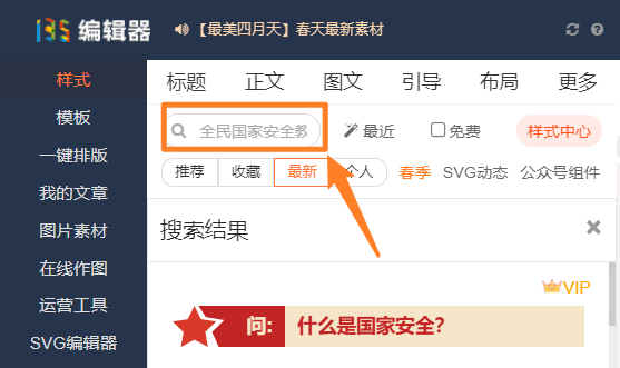 本次上新的全民國家安全教育日樣式,一共33個。包含正文、標題、圖片、二維碼、藝術(shù)字等多種樣式,在135編輯器內(nèi),搜索關鍵詞:全民國家安全教育日,即可使用。