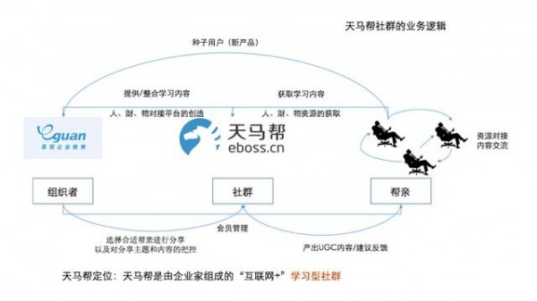 天馬幫的發(fā)起者是易觀,社群的用戶面向的是傳統(tǒng)中小企業(yè)的老板,以易觀為主輸出學習內容,幫親作為學習內容的受益者,在這個業(yè)務邏輯中有幾個關鍵點: