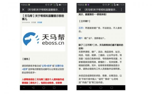 以上是天馬幫幫規(guī),通過規(guī)范和制度,在運營過程中不斷對會員進行引導和行為的約束。比如群內禁止發(fā)廣告、人生攻擊和政治討論,通過一段時間的引導和閱讀,群內成員會按照規(guī)定自發(fā)性的約束自己的行為,并自發(fā)性的監(jiān)督和懲罰發(fā)廣告等違反群規(guī)的行為。